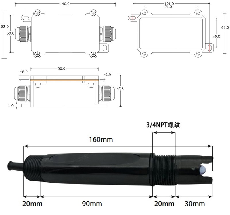 外形尺寸 電極:160mm*30mm(長度*直徑),3/4″NPT 螺紋