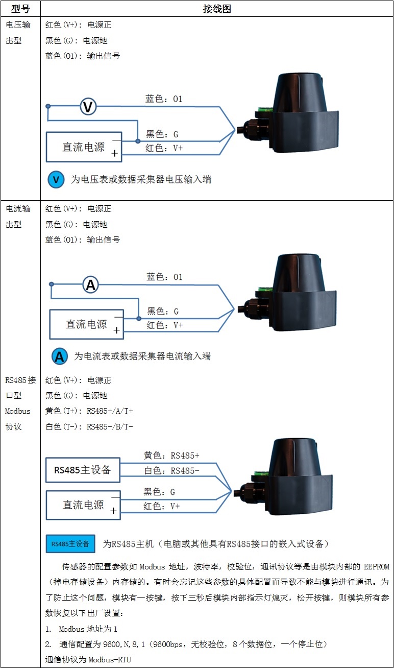 電流輸出4-20mA RS485接口,Modbus協(xié)議 RS485接口,Modbus協(xié)議 & 電壓0-2V輸出 RS485接口,Modbus協(xié)議 & 電流4-20mA輸出 SDI-12接口 客戶訂制 |