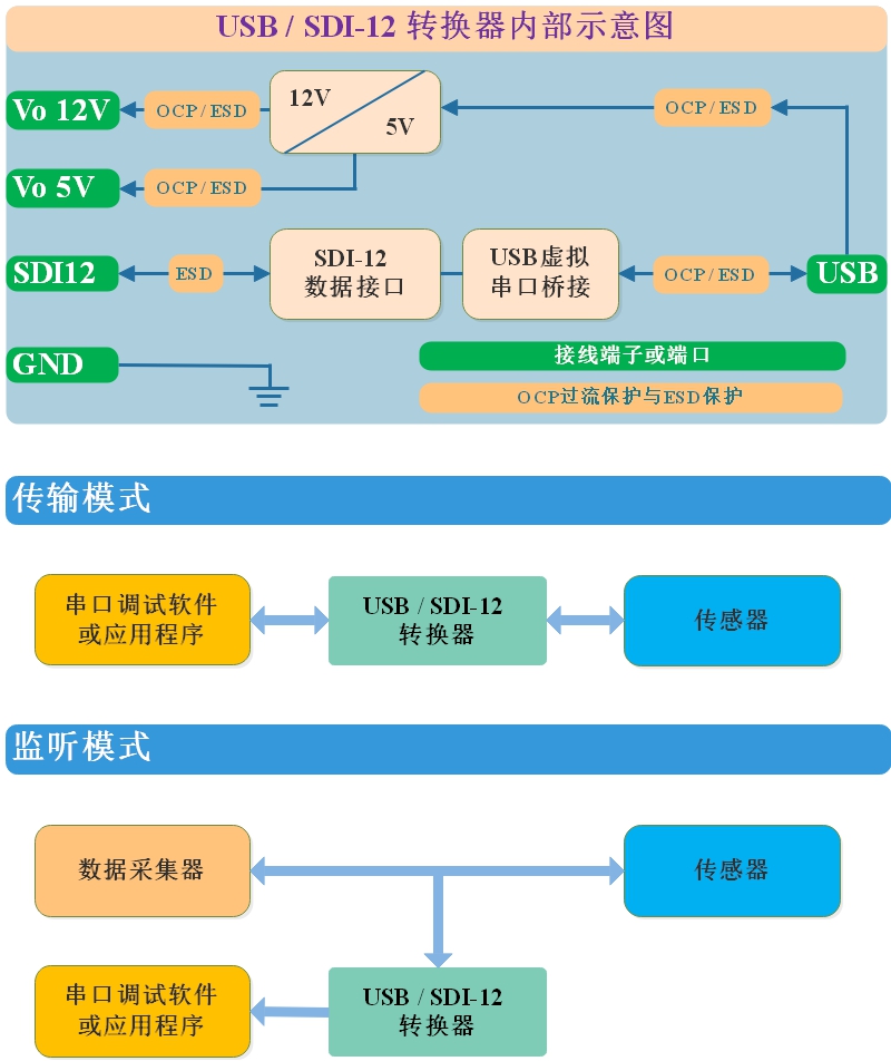 | 功能模式 | SDI-12總線的傳輸模式與監(jiān)聽模式 | ||